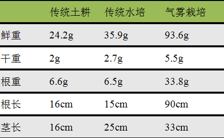 气雾栽培下茎叶生长速度是土耕的5倍,是传统水培的3倍。气雾栽培下根的生长速度较传统土耕和水培提高了6倍。